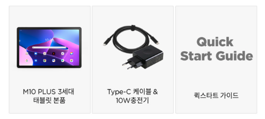 - 구성품 : 레노버 탭M10 플러스 3세대 본품 + 케이블&10W 충전기+퀵스타트 가이드